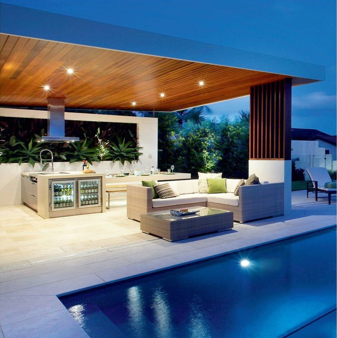 - Outdoor kitchen pergola – defines an outdoor dining and cooking space with room for lighting and fans.