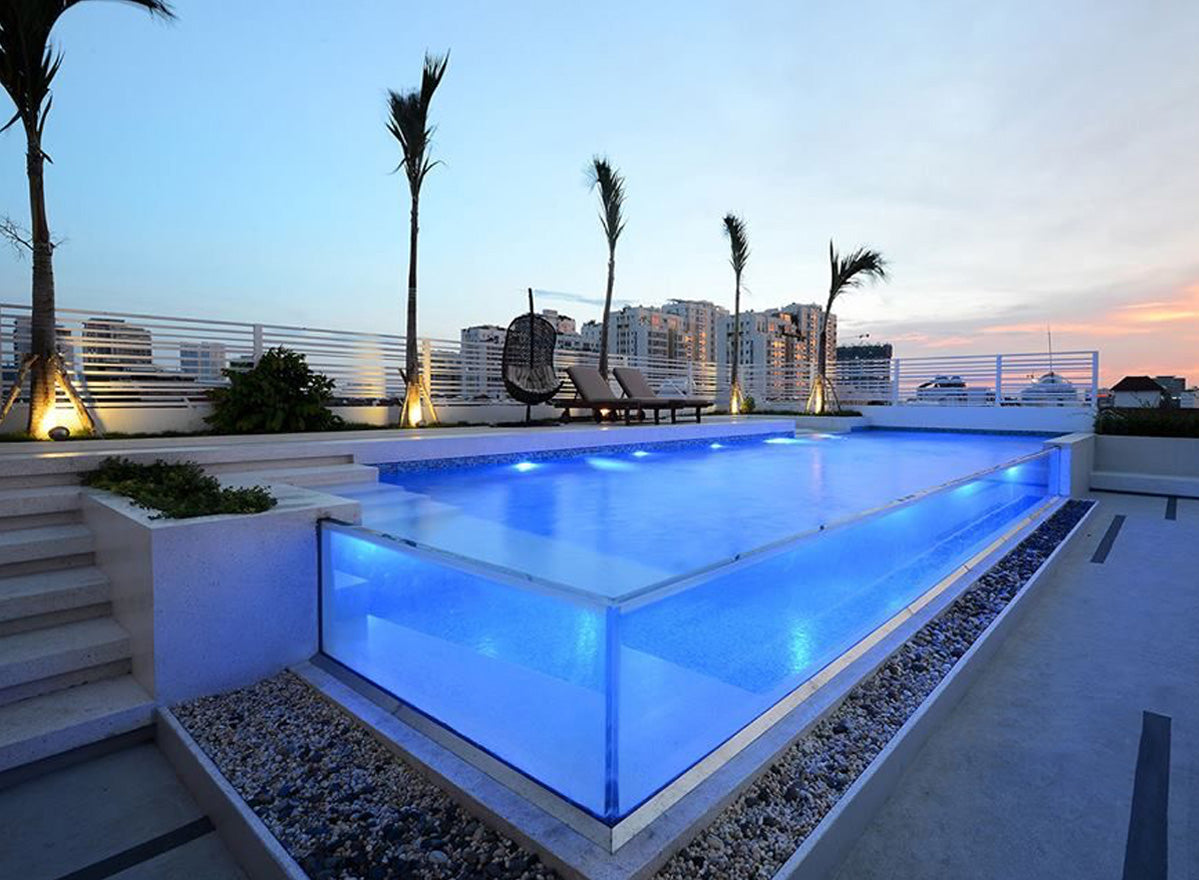 A glass wall is a striking pool feature that turns a swimming pool into a visual showcase. Acting as a clear underwater window without any top support beam, it creates the impression that the water ends vertically with no barrier. From the outside you can look straight into the pool without surface distortion, making it ideal for dramatic views and memorable photos—such as a swimmer captured partly above and below the water.